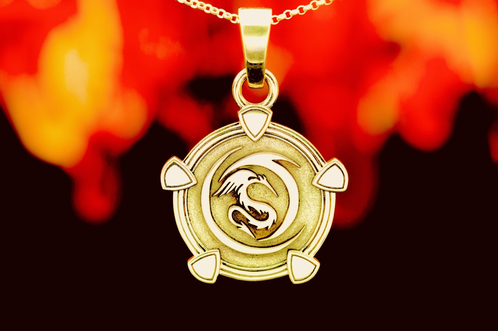 • Design: Detailed dragon motif with flowing lines and four protective triangular accents